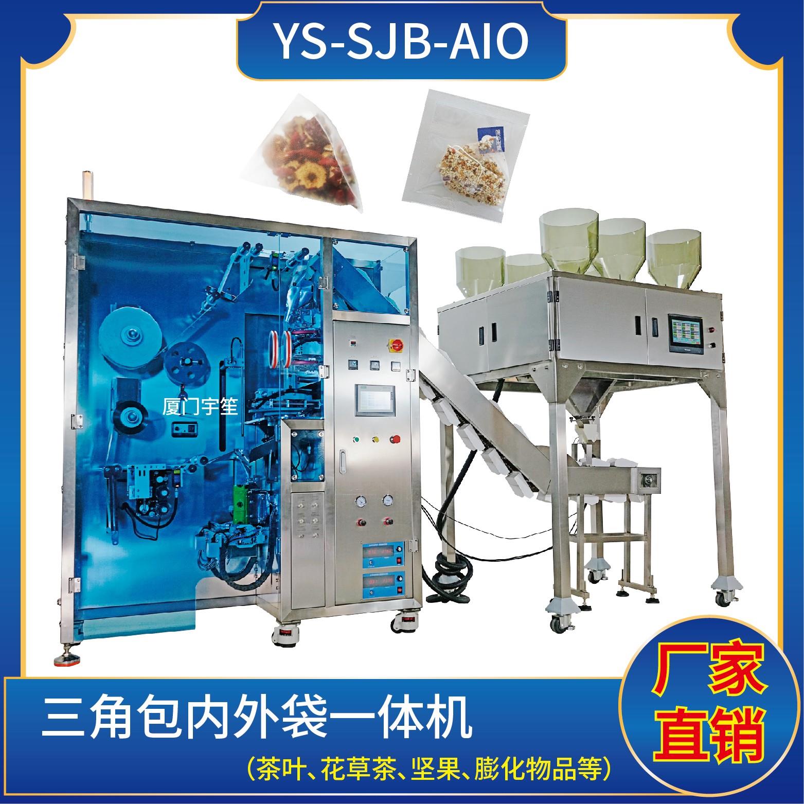YS-SJB-AIO 三角包內(nèi)外袋一體機(jī)特 點(diǎn) 1、適用于綠茶、紅茶、花茶、咖啡、中國茶、健康茶、中藥茶、顆粒等。2、可用于平面袋包裝、三角立體包裝等形式包裝袋。3、整機(jī)可自動完成上料、計(jì)量、制袋、封口、切斷、計(jì)數(shù)、成品輸送等功能。4、選用進(jìn)口超聲波封口,電子稱計(jì)量下料方式,封口牢固,下料準(zhǔn)確。5、包裝材料:尼龍、P…