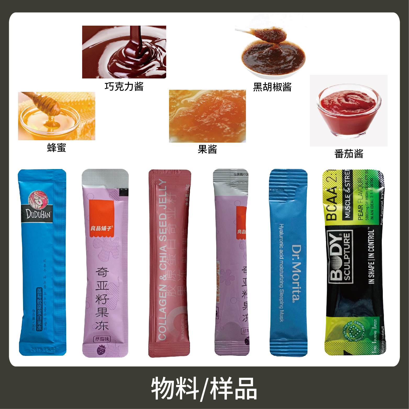 應(yīng)用:適用于醬料物品的計量包裝,如:護(hù)膚品、蜂蜜、果凍、酵素、維生素等。